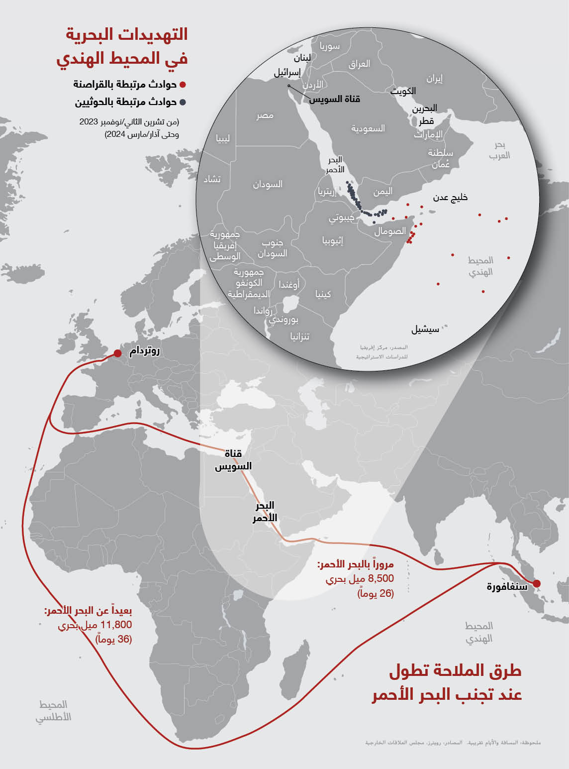 ويقولان: ”وكان لذلك تداعيات واضحة على الفور، فقد ابتعدت شركات الشحن العالمية عن البحر الأحمر، فتغيرت تدفقات الشحن بين الأسواق العالمية الضخمة في آسيا وأوروبا. وارتفعت أقساط التأمين على الشحن بشدة، فارتفعت أسعار السلع على المستهلكين في إفريقيا وفي العالم أجمع.
