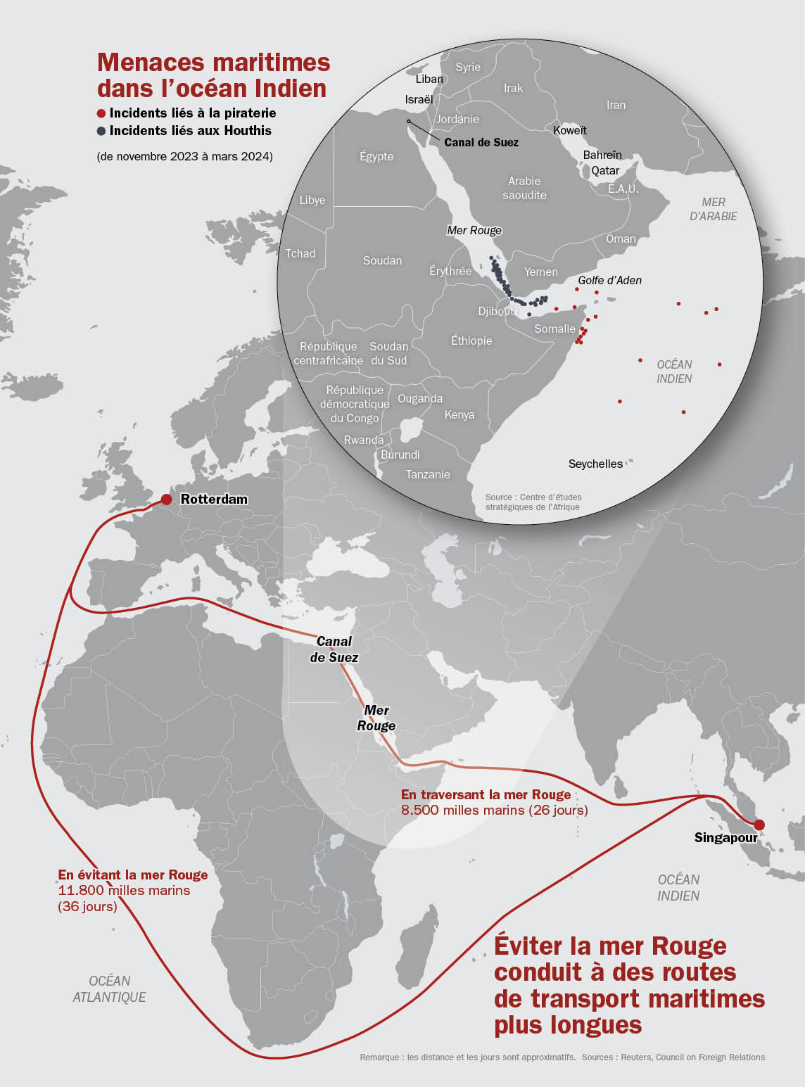 « Les répercussions ont été immédiatement visibles. Les compagnies maritimes internationales se sont éloignées des routes de la mer Rouge, en modifiant ainsi les flux de transport entre les immenses marchés mondiaux que sont l’Asie et l’Europe. Les primes d’assurance pour le transport maritime ont grimpé en flèche, augmentant le coût des marchandises pour les consommateurs en Afrique et dans le monde entier. Les changements de route autour de l’Afrique du Sud peuvent ajouter jusqu’à deux semaines et 6.000 milles marins supplémentaires au voyage d’un navire. »