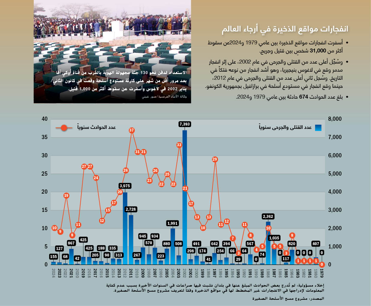 O incidente de Lagos não foi o primeiro nem o último deste tipo em África ou no mundo. De acordo com o Small Arms Survey, “explosões não planeadas em locais de munições” já mataram ou feriram 31.489 pessoas em todo o mundo, de Janeiro de 1979 a Dezembro de 2024. Das 674 explosões nesse período, seis das 10 com mais vítimas ocorreram em África, incluindo os dois incidentes mais graves, segundo o Survey. O incidente de Lagos fez de 2002 o ano mais perigoso nesse período. O segundo maior número de vítimas ocorreu 10 anos depois, quando explosões abalaram um depósito em Brazzaville, na República do Congo.