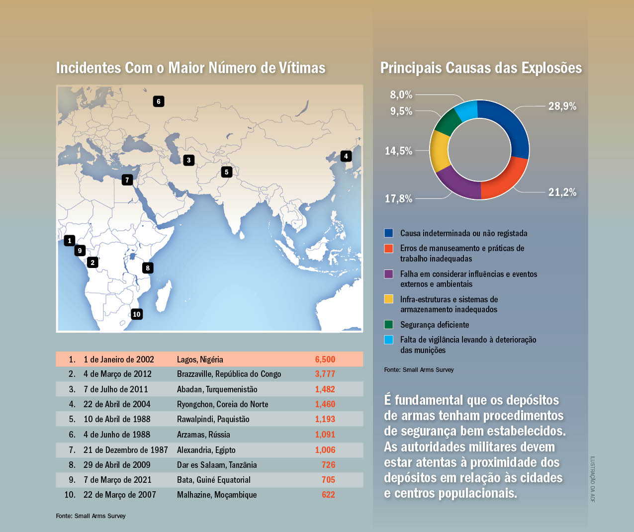 Erros de manuseamento e práticas de trabalho inadequadas causaram um quinto desses incidentes, de acordo com o Small Arms Survey. Outras causas significativas incluíram a falha em levar em conta influências externas e ambientais, armazenamento inadequado, deterioração de armamentos e segurança deficiente.